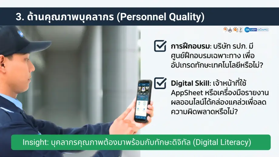 [ ] การฝึกอบรมเฉพาะทาง: บริษัท รปภ. ที่ใช้อยู่ มี ศูนย์ฝึกอบรมเป็นของตัวเอง เพื่ออัปเกรดทักษะด้านเทคโนโลยีให้เจ้าหน้าที่หรือไม่?