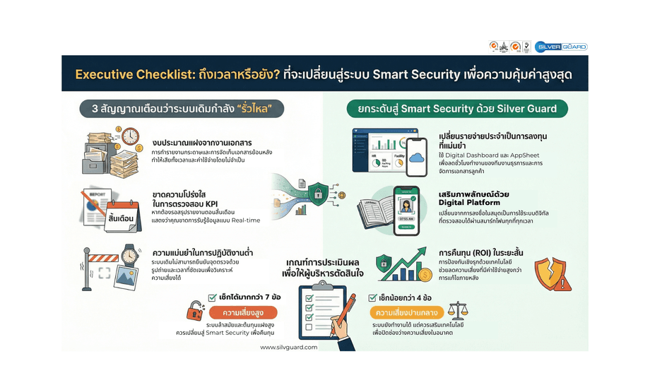 Check ได้มากกว่า 7 ข้อ: ระบบเดิมของคุณเริ่มล้าสมัยและมีค่าใช้จ่ายแฝงสูงเกินไป การเปลี่ยนมาใช้ระบบ Smart Security คือ วิธีลดค่าใช้จ่ายด้านความปลอดภัย ที่จะช่วยคืนทุน (ROI) ให้องค์กรได้ภายในระยะเวลาอันสั้น